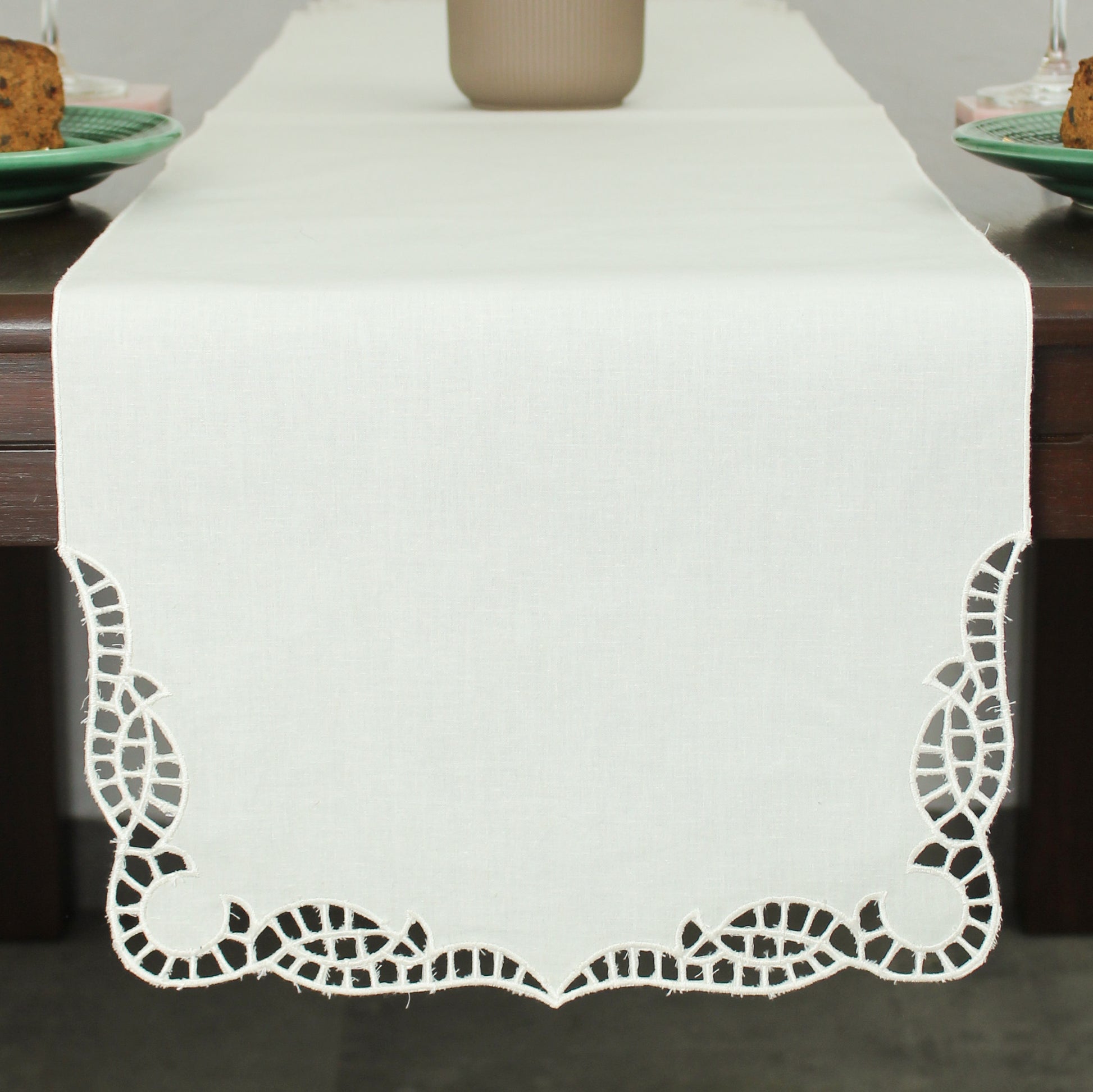 Add timeless elegance to your table setting with our exquisite cutwork table runner, featuring a beautifully intricate scallop border on each side reminiscent of vintage designs. Crafted with precision, the delicate cutwork patterns create a charming interplay of texture and detail, making it perfect for both everyday dining and special occasions.