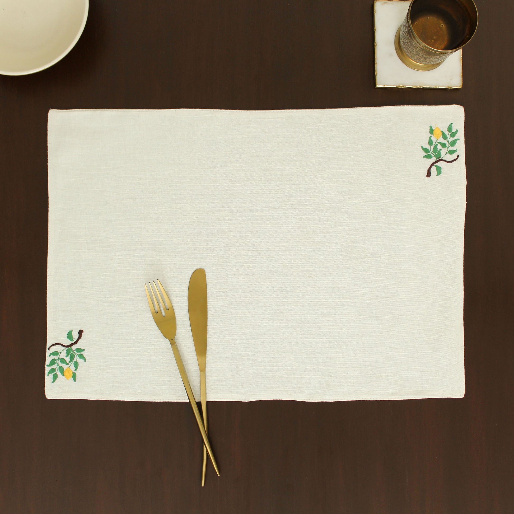 Our Aspen placemat is a refreshing and vibrant placemat with yellow lemon and green leaf embroidery. The base fabric is made from a mix of cotton and linen that adds the perfect soft feel to the cheerful and bright summer design. This placemat will bring alive the ambience of any gathering by adding a touch of vibrant summer pop.
