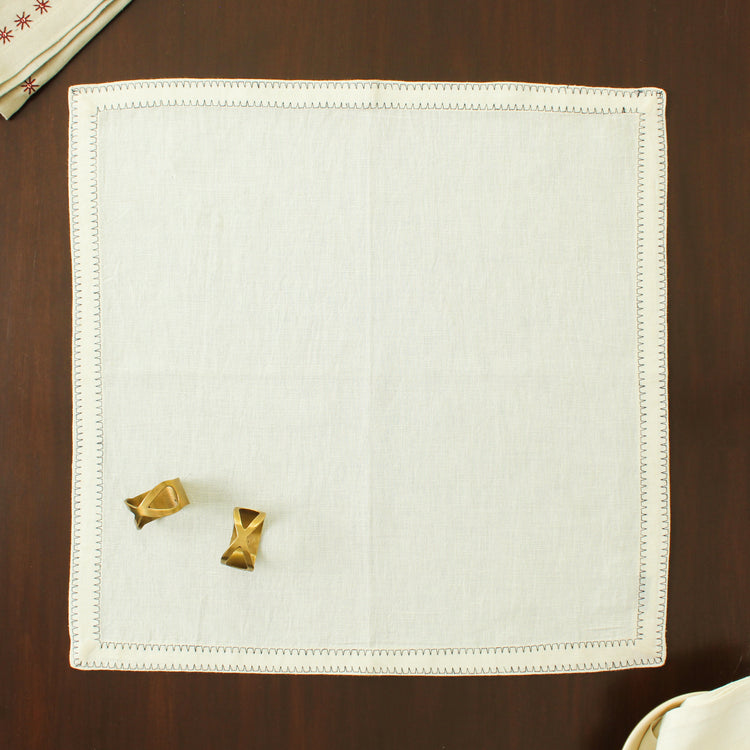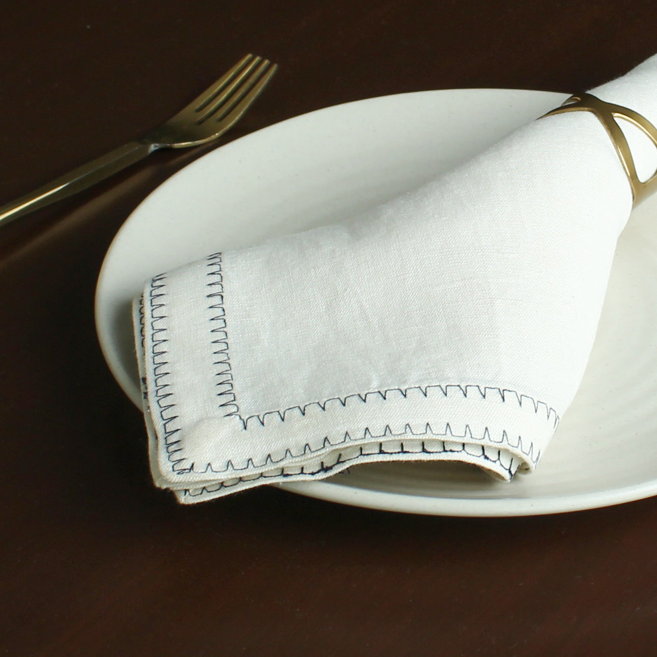 Add a touch of elegance to your table setting with this beautifully crafted cotton and linen napkin. Soft yet durable, it features intricate black embroidery along the edges, creating a classic and timeless design. Perfect for both everyday use and special occasions, this napkin is a versatile addition to any dining experience. Its natural blend of cotton and linen ensures a luxurious feel, while the black detailing adds sophistication and class to this design.