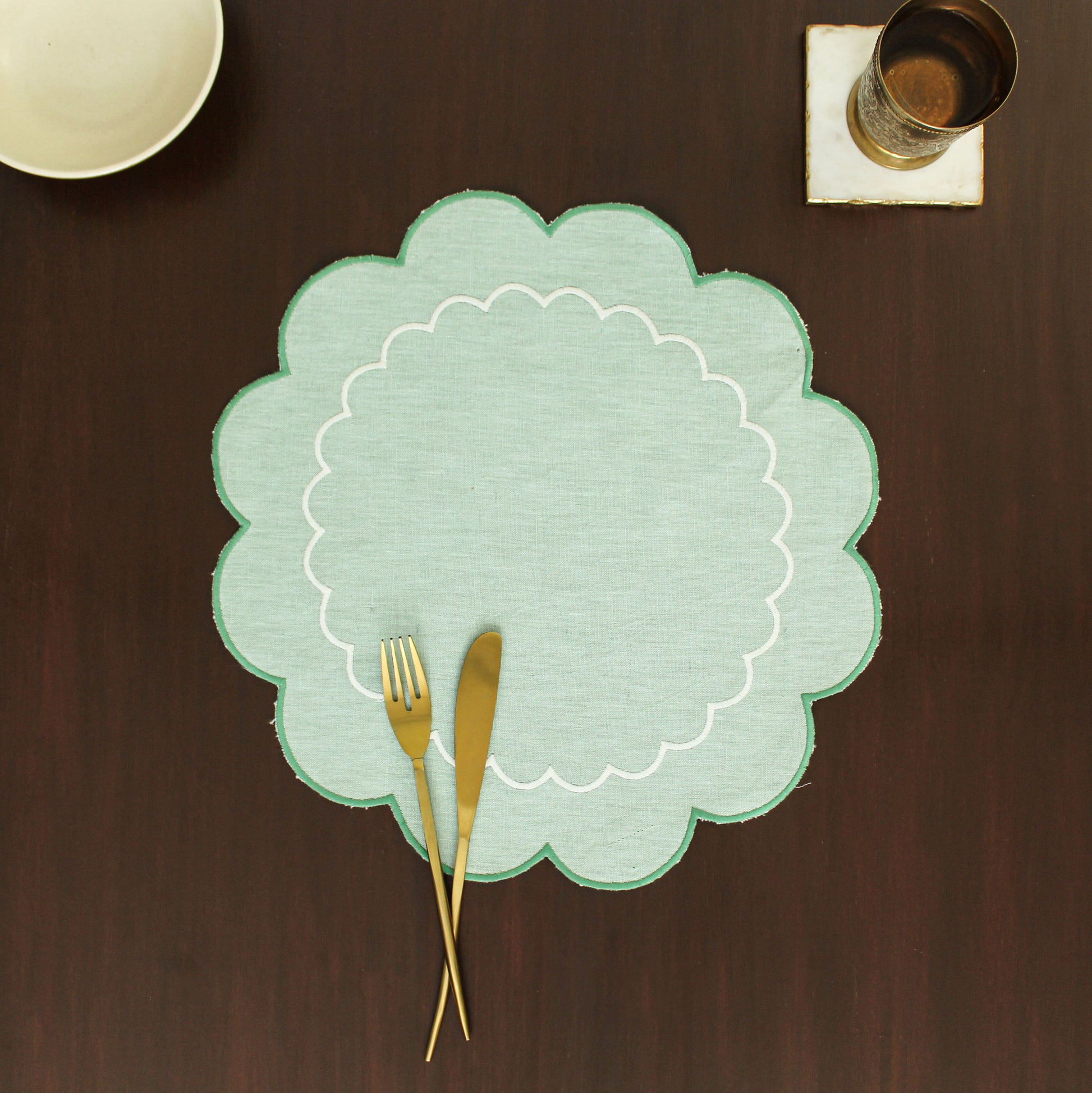 Our Green Meadows scallop placemat has simple white embroidery on a soft, muted green fabric that is both smooth and durable. The minimalist stitching emphasizes the scallop shape without overwhelming the design, making this placemat a charming and versatile addition to any table setting. The beautiful color adds vibrance while maintaining the minimalistic design of this trendy yet elegant placemat