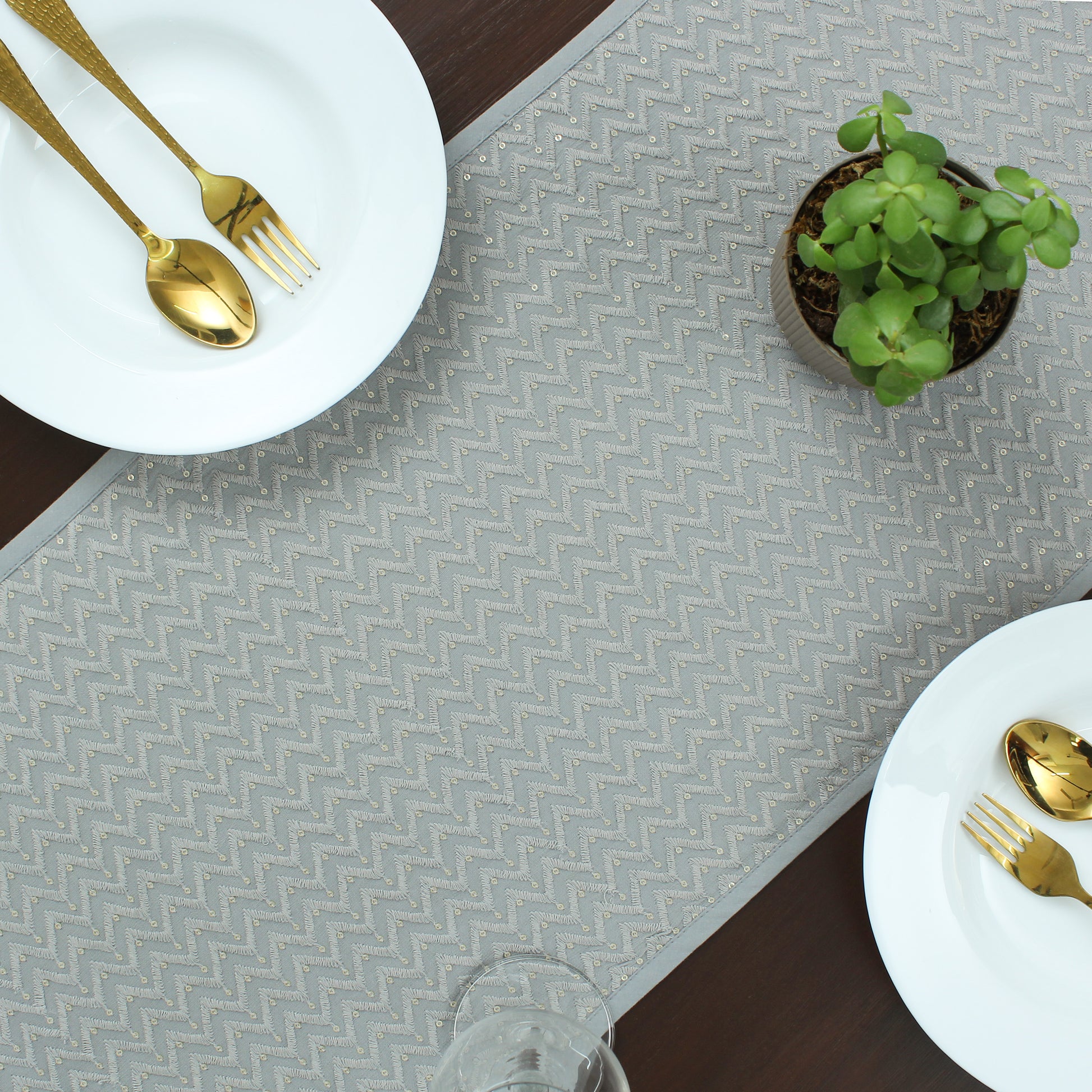 Add a touch of elegance to your table setting with our chikankari table runner in soft grey, featuring a refined triangle pattern. This exquisite table runner is hand-embroidered using the traditional Chikankari technique, renowned for its intricate detail and artistry. The geometric triangle design adds a contemporary flair to the soft grey fabric, making it perfect for both modern and classic interiors. Ideal for special gatherings or everyday dining, this table runner brings a sense of grace and sophistication to your space.