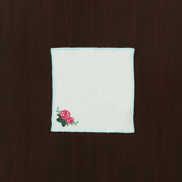 Add a touch of elegance and romance to your dining table with our beautifully embroidered cocktail napkin featuring a stunning red rose design. The rose, meticulously stitched with vibrant red threads, showcases fine details in its petals, offering a lifelike texture and a sophisticated look. The blue embroidery around the napkin further enhances the look adding a beautiful and vibrant contrast.