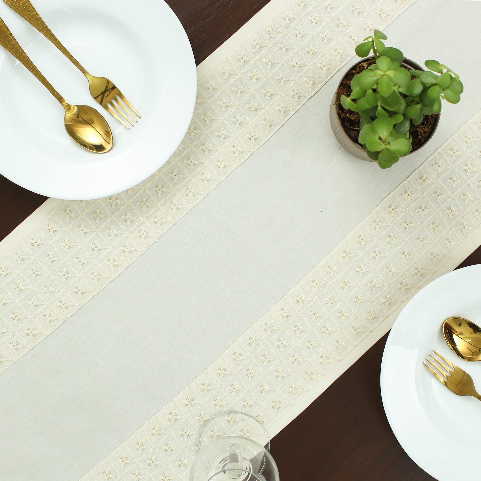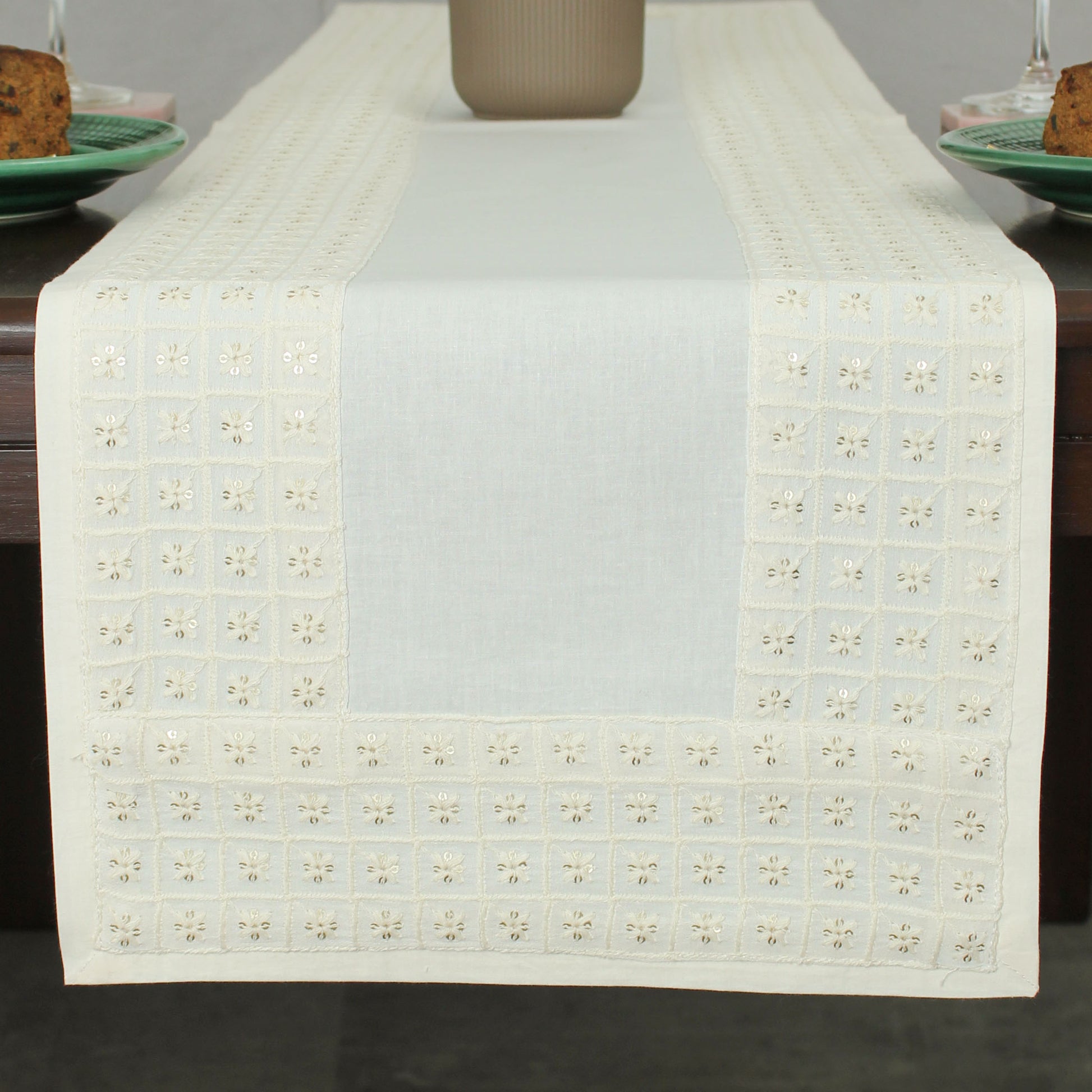 Celebrate the timeless beauty of Indian craftsmanship with our chikankari pure white sequin unner. Handcrafted using the ancient art of Chikankari, a traditional embroidery technique from Lucknow, this runner is a true embodiment of India’s rich cultural heritage. Villages in india that specailise in chikankari craft struggle to survive amongst the mass produced textiles.This runner is an ode to the glory of the skilled and meticulous chikankari artisnas.