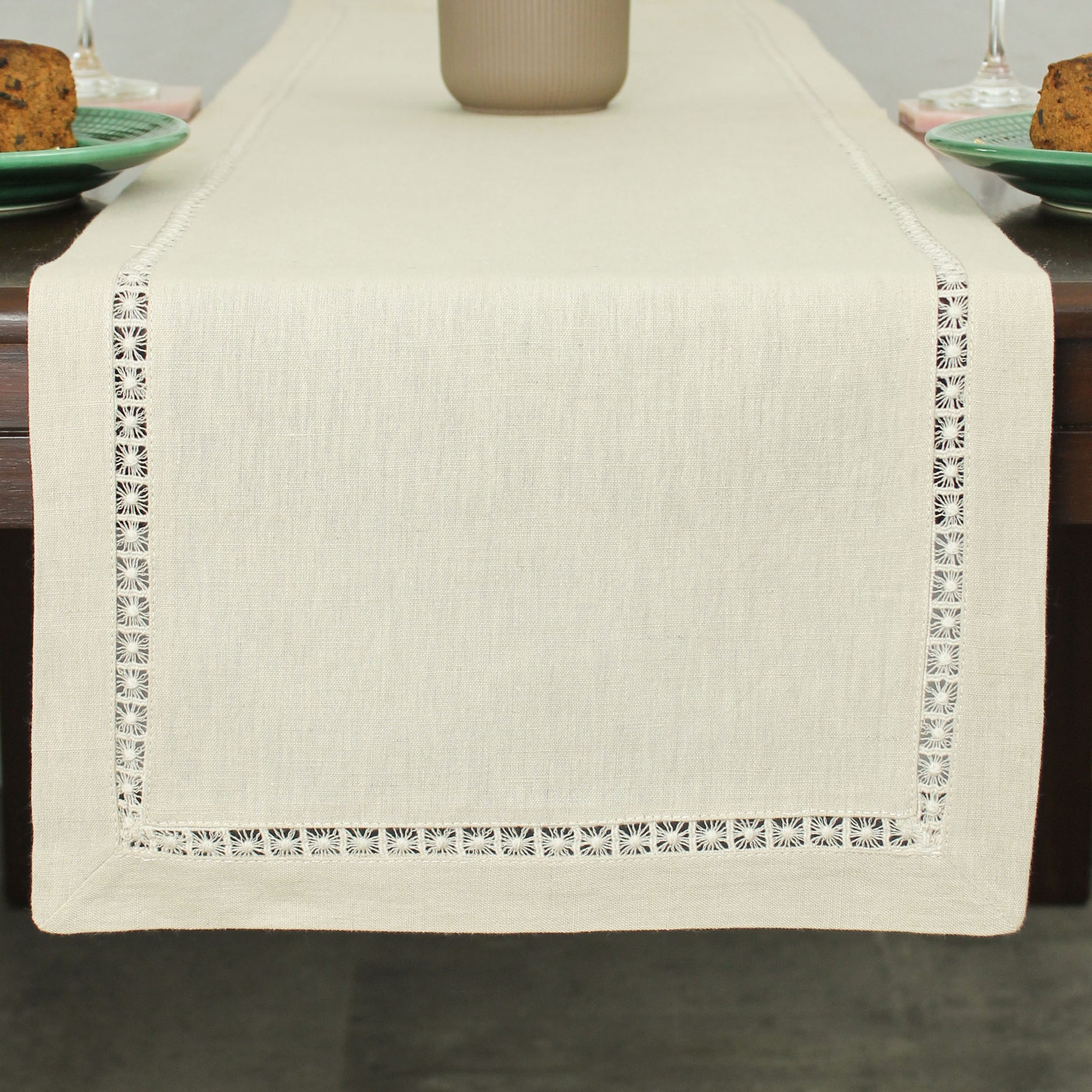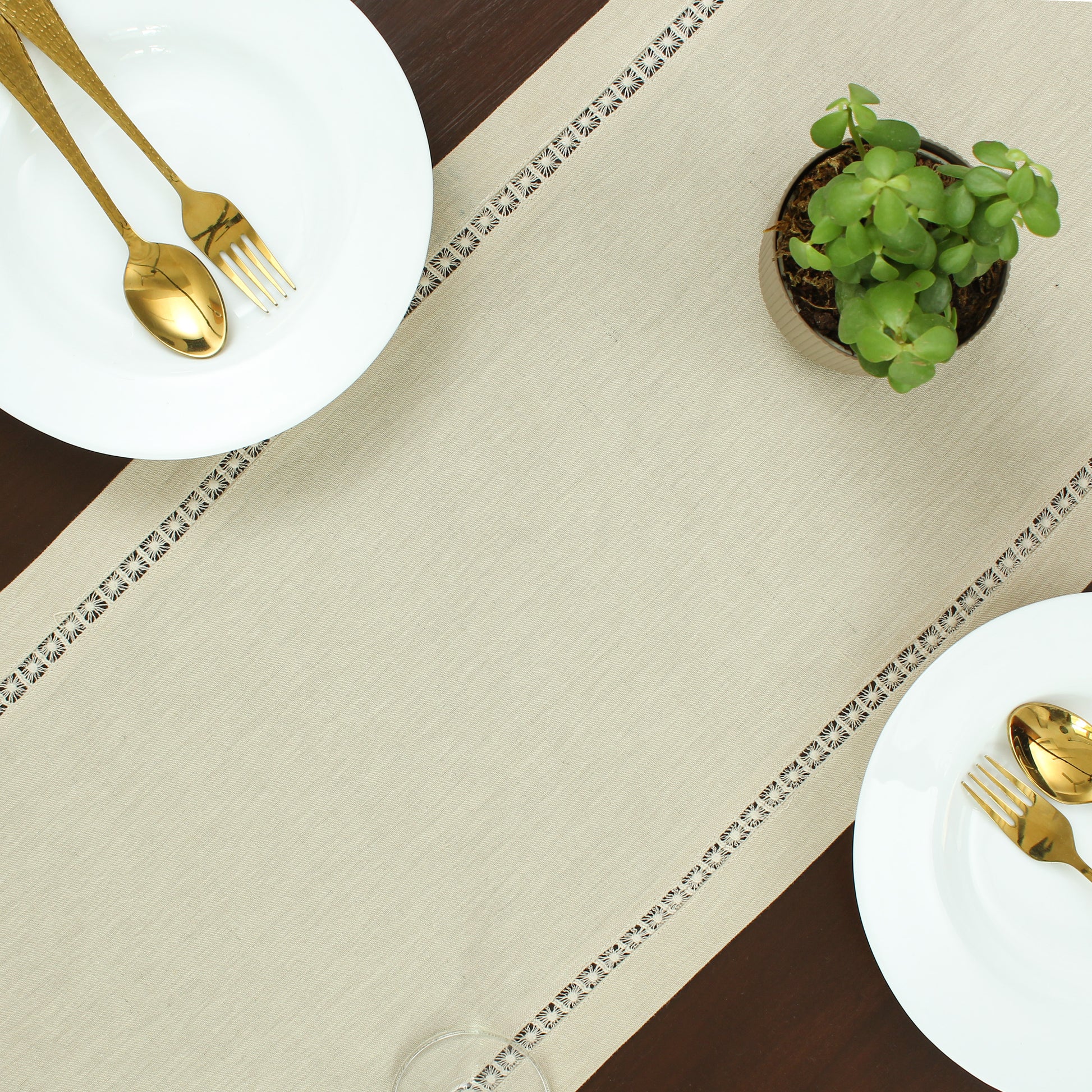 Add timeless elegance to your dining table with our beautiful beige runner, adorned with a delicate star lace trim. The neutral beige hue complements any décor, while the intricate lace detail brings a subtle touch of sophistication to every meal. Crafted for both style and functionality, this runner protects your table while enhancing the overall aesthetic of your dining experience. Perfect for special occasions or everyday use, this table runner combines elegance with practicality.