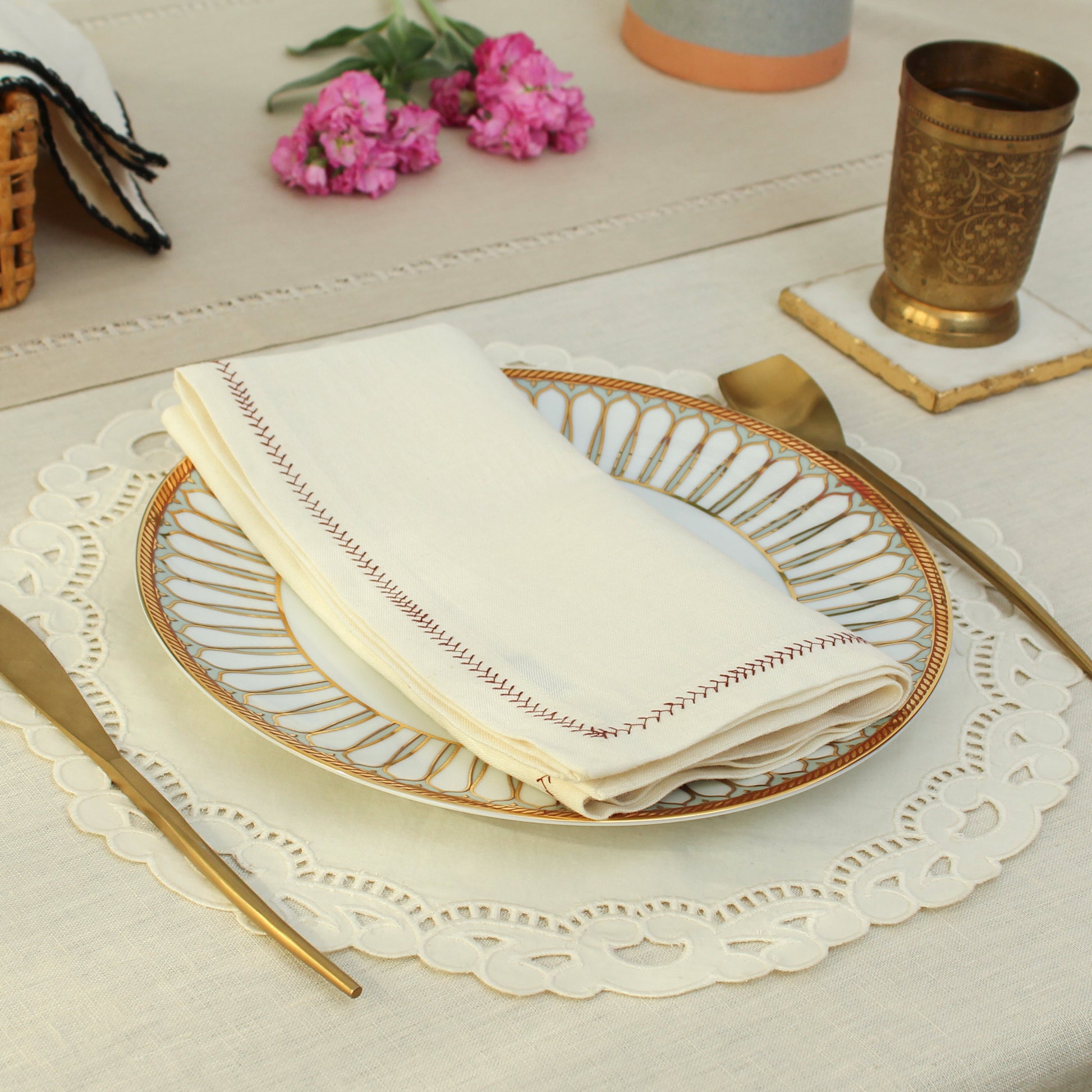 Add a touch of elegance to your table setting with this beautifully crafted cotton and linen napkin. Soft yet durable, it features intricate maroon embroidery along the edges, creating a classic and timeless design. Perfect for both everyday use and special occasions, this napkin is a versatile addition to any dining experience. The natural blend of cotton and linen ensures a luxurious feel, while the maroon detailing adds sophistication and class to this design.