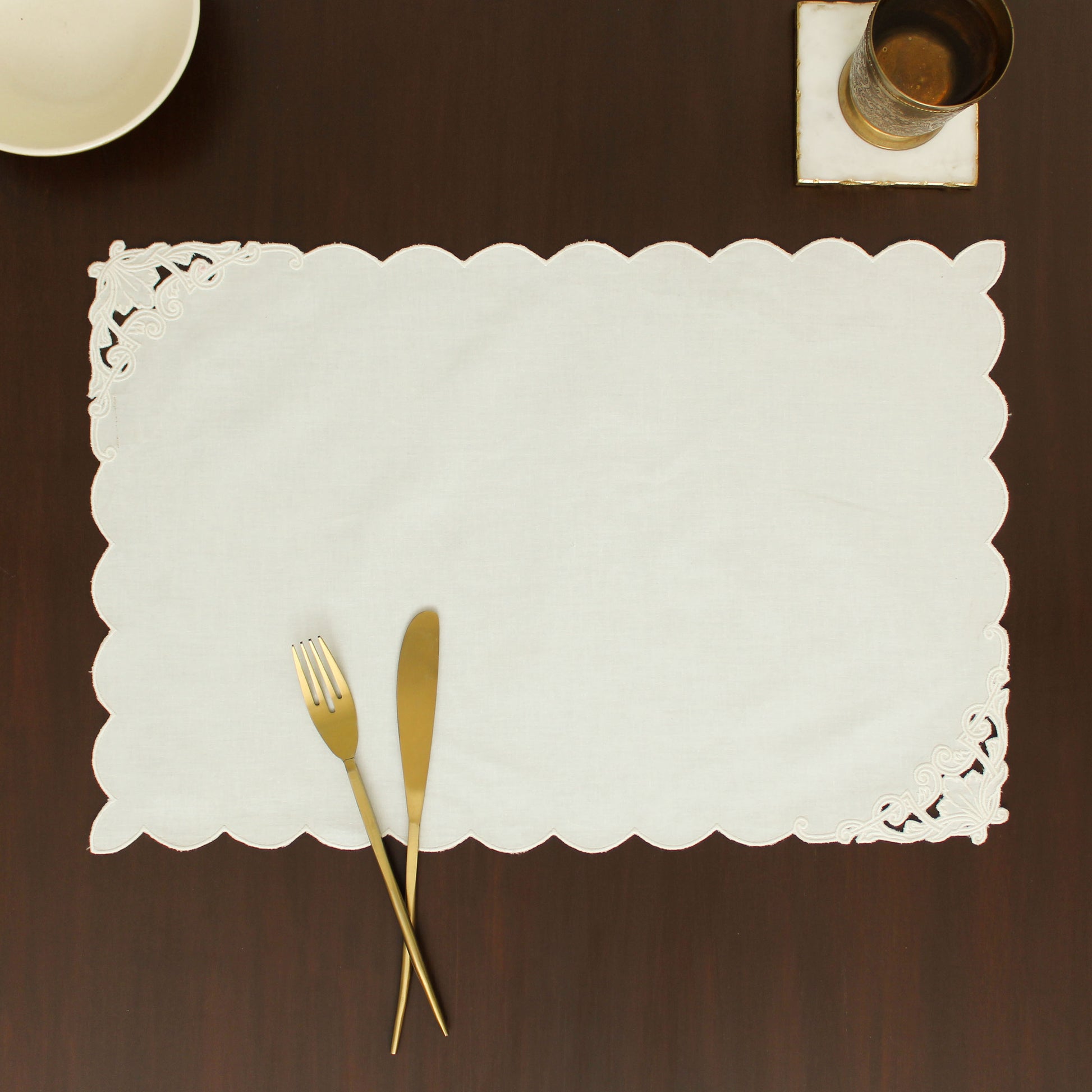 Elevate your dining experience with our stylish placemat featuring intricate cutwork designs on two sides. The simplicity yet uniqueness of the design is the beauty of this placemat, adding a hint of sophistication to any party. The scallop adds to the vintage charm and timeless design, making it a classy addition to your table. This placemat is perfect for a classy wedding table decor, uplifting the grace and elegance of any gathering.
