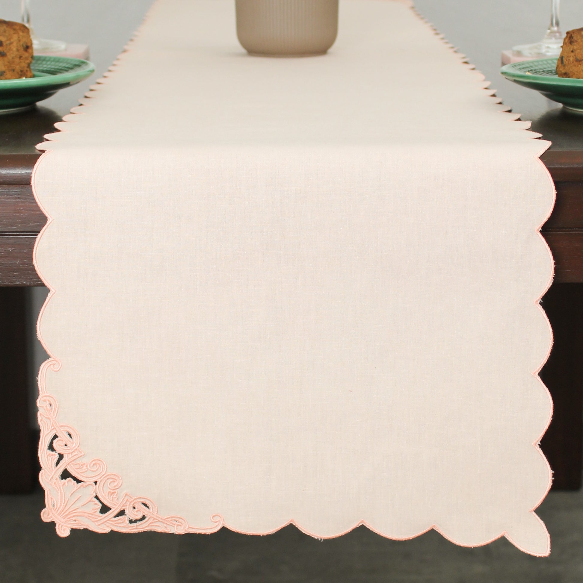 Elevate your dining experience with our stylish runner featuring intricate cutwork designs on two edges. The simplicity yet uniqueness of the design is the beauty of this runner, adding a hint of sophistication to any party. The scallop adds to the vintage charm and timeless design, making it a classy addition to your table.