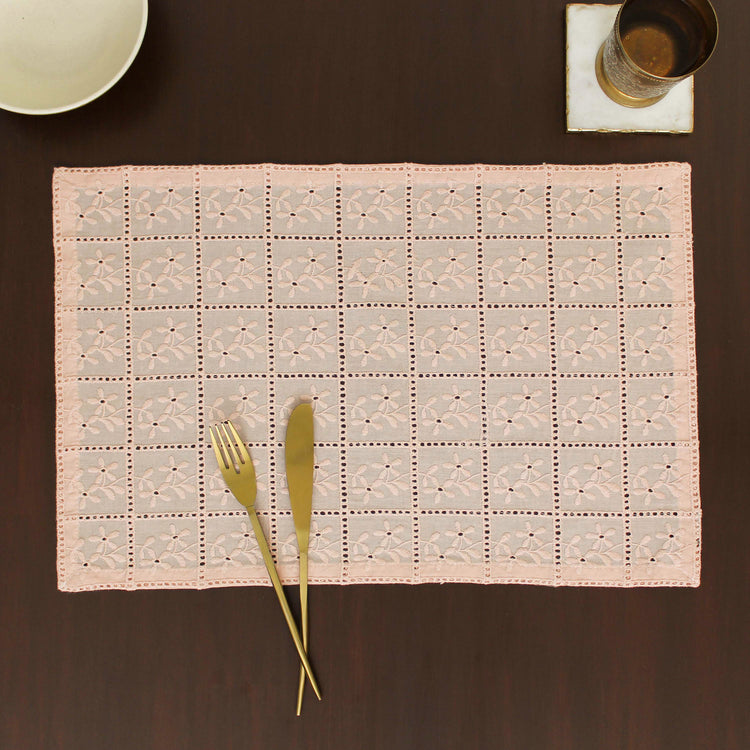 Add a touch of elegance to your dining table with our Schiffli placemat featuring delicate flowers encased in a box design. Expertly crafted using the renowned Schiffli embroidery technique, this placemat showcases intricate floral patterns framed within a refined geometric border, combining classic charm with modern sophistication.