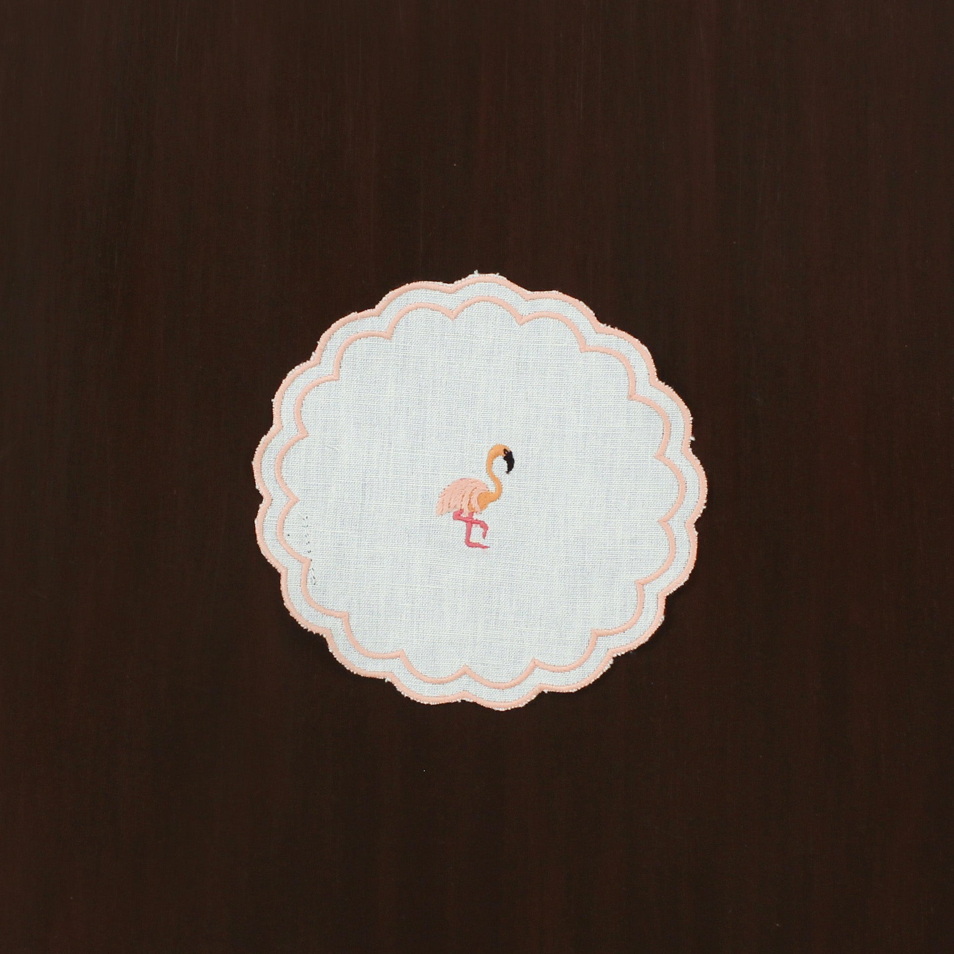 This beautiful scallop cocktail napkin with an embriodered flamingo in the centre is a perfect combination of a unique design with the elegance of soft tones. Flamingo's with their slender legs and long graceful necks are a sight of beauty and the inspiration behind this cocktail napkin. Made from a mix of cotton and linen, this napkin is bound to make a strong style statement for your table setting.