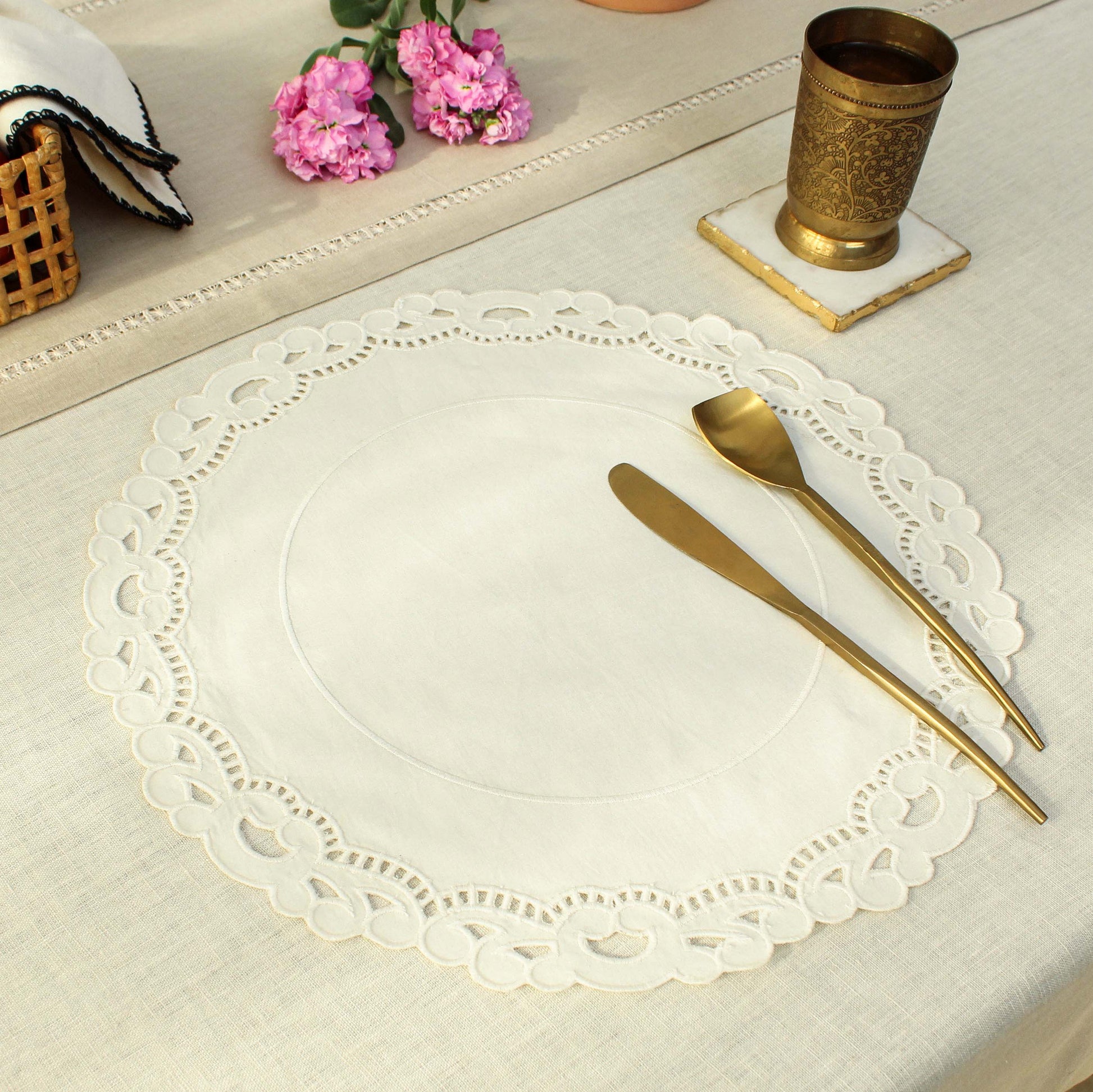 Our exquisite round cutwork placemat is a perfect blend of elegance and craftsmanship, designed to elevate any table setting. Made from high-quality cotton, this placemat features a beautifully intricate cutwork pattern, skillfully handcrafted to showcase delicate lace-like designs. The round shape adds a unique touch, making it a standout piece for both casual and formal dining occasions and wedding set ups.