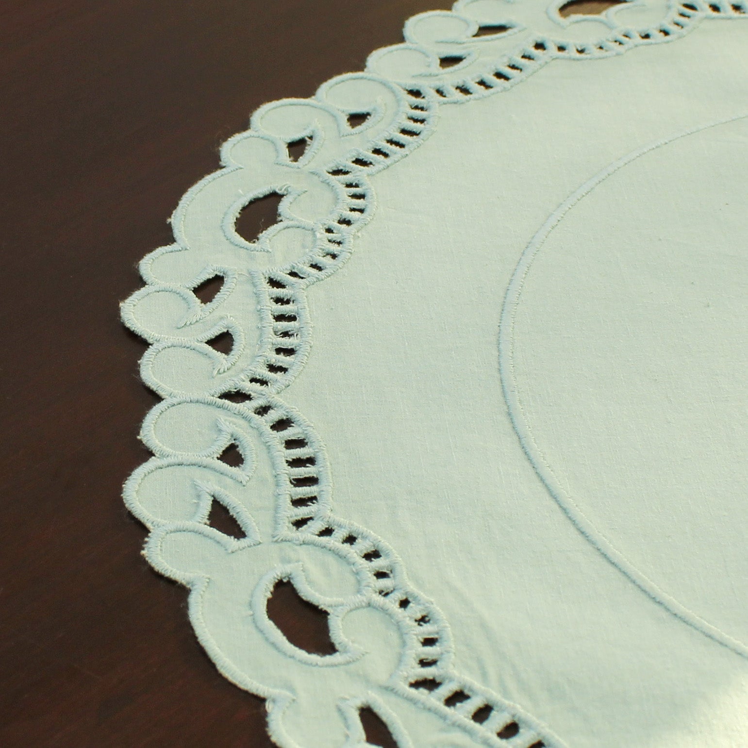 Our exquisite round cutwork placemat is a perfect blend of elegance and craftsmanship, designed to elevate any table setting. Made from high-quality cotton, this placemat features a beautifully intricate cutwork pattern, skillfully handcrafted to showcase delicate lace-like designs. The round shape adds a unique touch, making it a standout piece for both casual and formal dining occasions and wedding set ups.