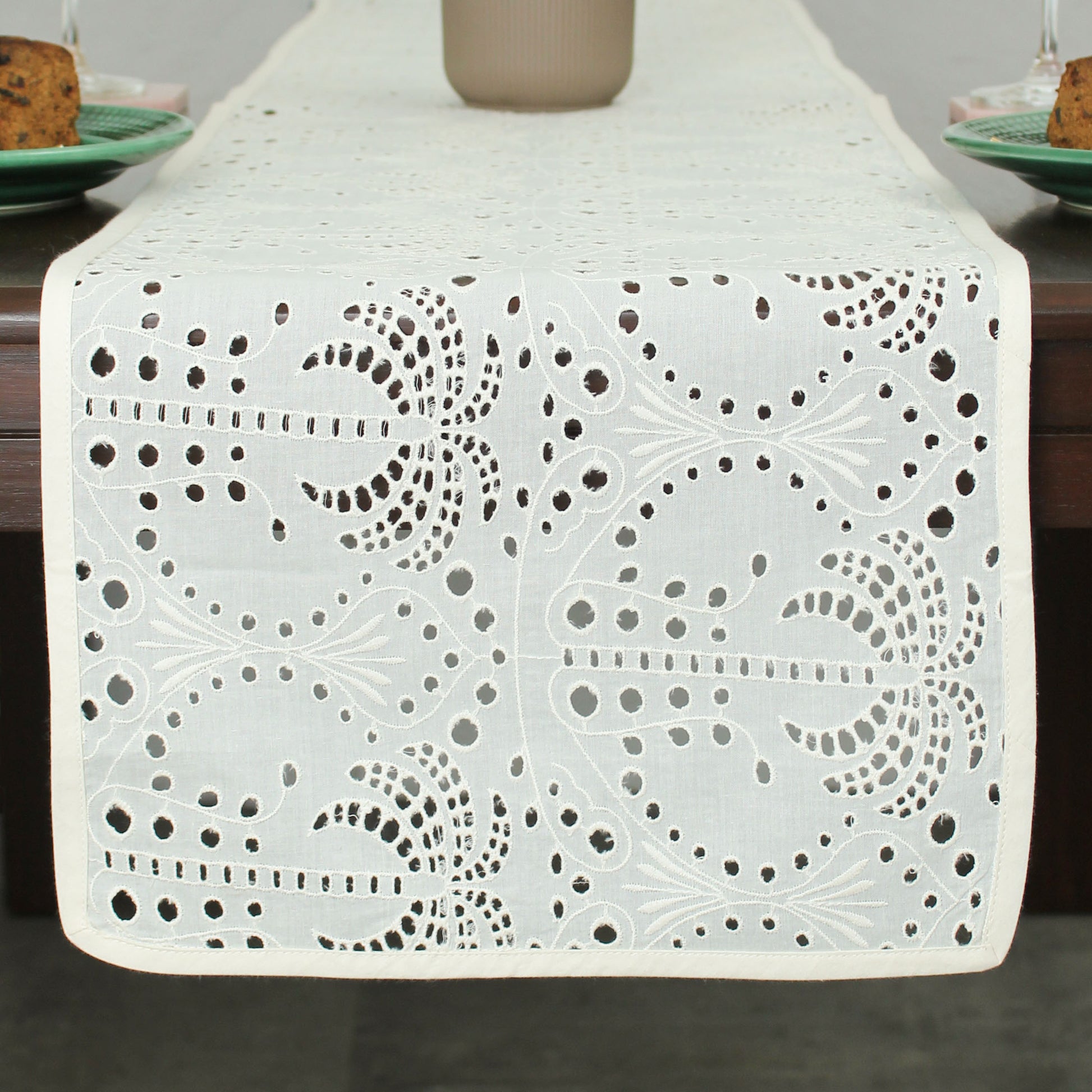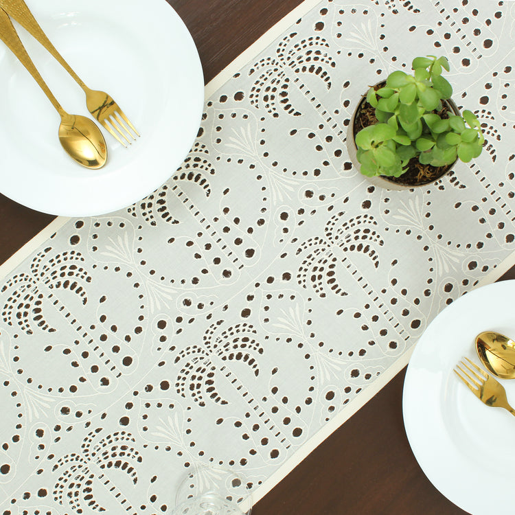 Elevate your table setting with our elegant Schiffli palm tree runner. Our Spiti runner features beautifully detailed palm tree motifs, bringing a touch of tropical sophistication to your dining experience. The Schiffli technique ensures precise, high-quality stitching, creating a delicate and refined look. Ideal for tropical, coastal, or nature-inspired themes, this runner is functional, stylish and unique.