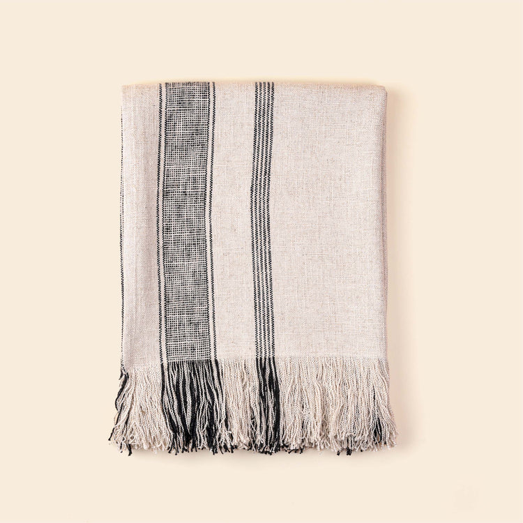 Timeless and versatile, our black and white striped throw brings a classic evergreen design to your home. The bold stripes create a striking visual appeal, while the frayed edges add a touch of casual charm. Made from soft, high-quality materials, this throw is perfect for year-round comfort and style, effortlessly complementing any décor.